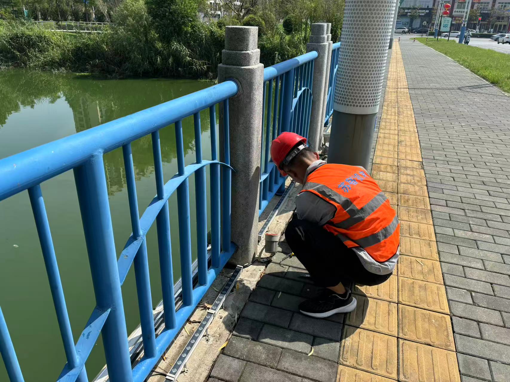 針對(duì)部分沿河燈具因人為踩踏、駁岸風(fēng)化等原因造成的底座松動(dòng),維護(hù)團(tuán)隊(duì)及時(shí)采取加固措施,通過(guò)加裝地錨、使用加固材料等方式消除隱患,全力保障園區(qū)亮化設(shè)施亮燈率穩(wěn)定在97%以上。